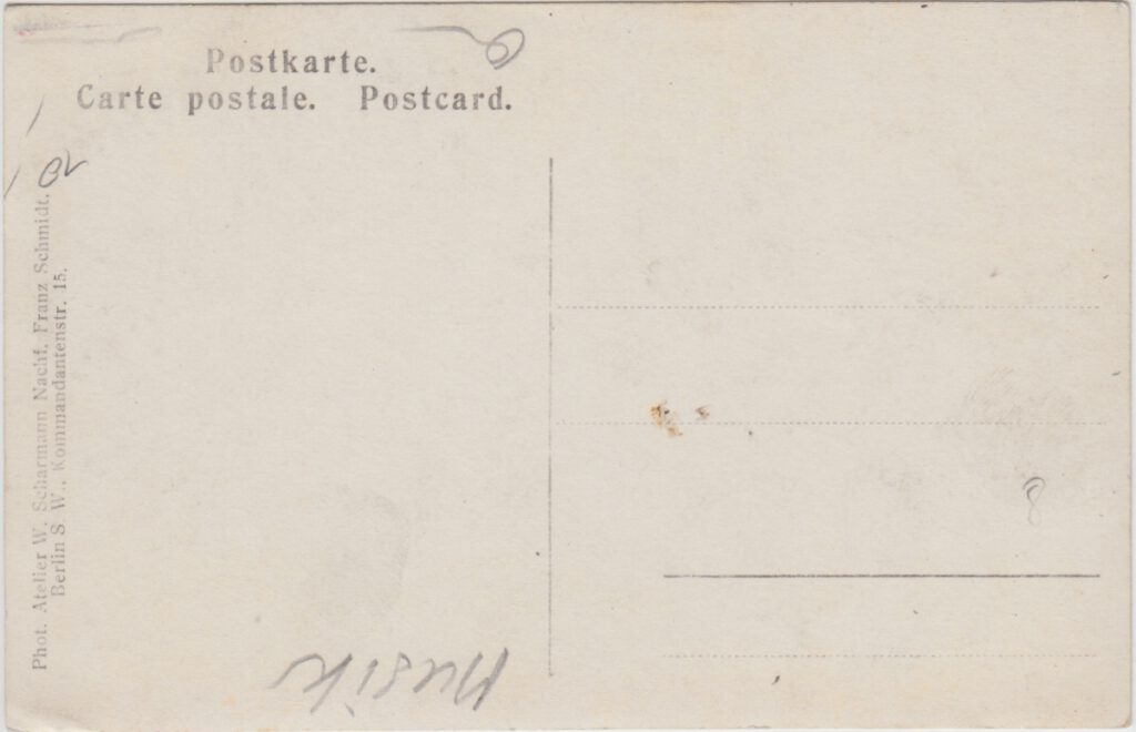 Rückseite: Phot. Atelier W. Scharmann Nachf. Franz Schmidt, Berlin S. W. Kommandantenstr. 15