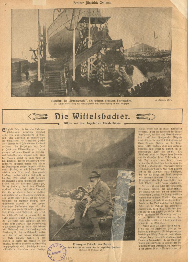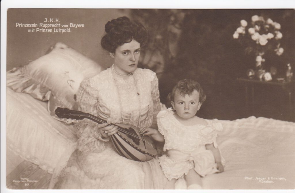 Prinz Ludwigs ältester Sohn Ruppecht hat des Großvaters Liebe zu den schönen Künsten geerbt. Wir bringen den zum dereinstigen König Bayerns ausersehenen Prinzen, der z. Zt. als Generalmaior nach Bamberg kommandiert ist, im Bilde und führen unseren Lesern in anmutigster Familienszene seine Gemahlin, die jugendliche Prinzessin Marie Gabriele vor, die dem Prinzen Luitpold, dem Urenkel des Regenten, die Mandoline vorspielt.