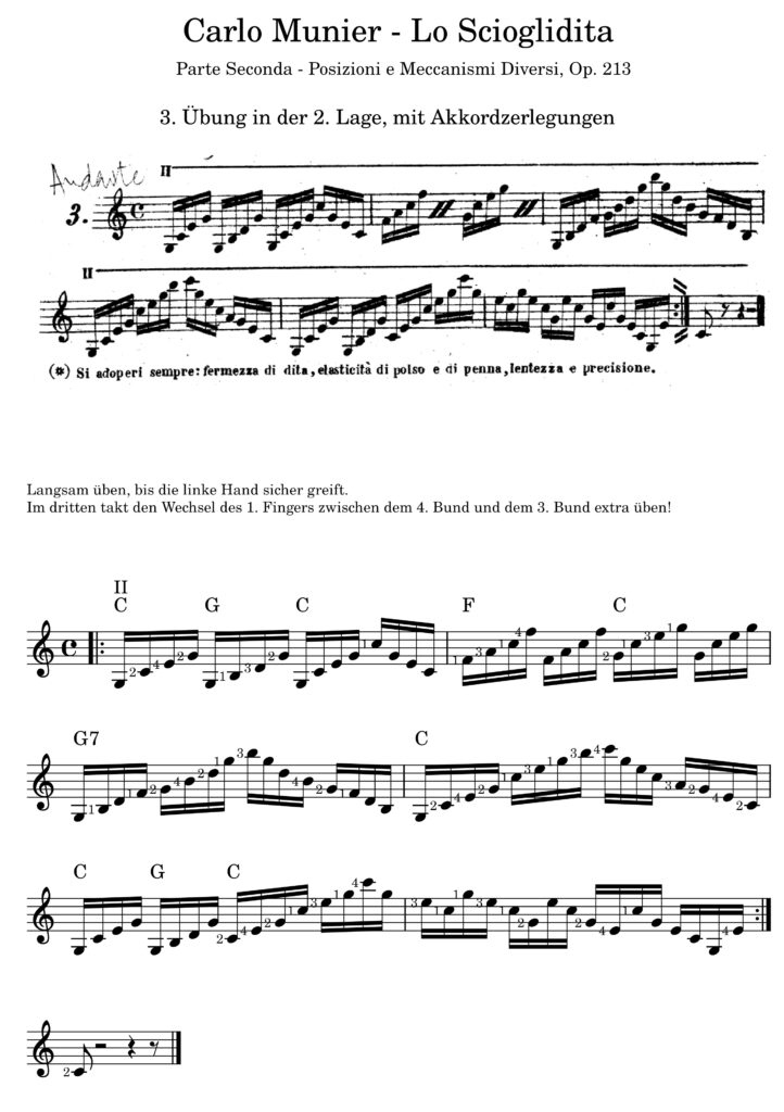 Diese Übung ist komplett in der 2. Lage. Wenn man die Noten in der zweiten Lage gut geübt hat sollte das kein Problem sein.