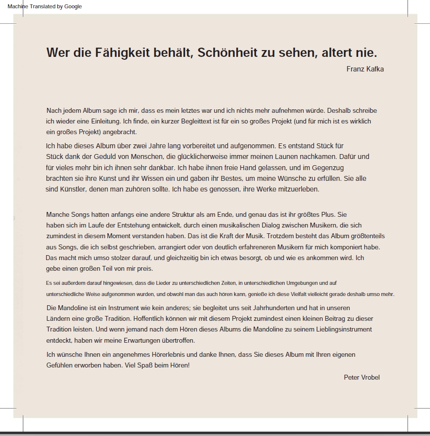 Entstanden ist ein klangvolles und sehr abwechslungsreiches Album bei dem die Mandoline in ganz verschiedenen Klangräumen präsentiert wird.