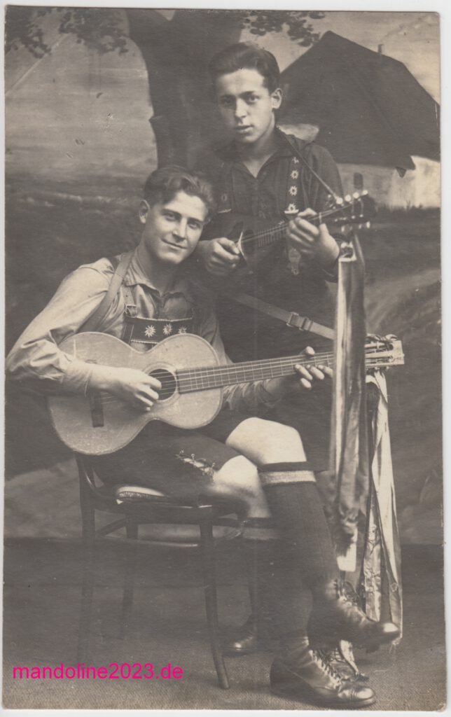 Die alte Postkarte zeigt einen Mandolinenspieler und einen Gitarrenspieler. Beide tragen eine Art von Tracht. Zu erkennen sind die bestickten Hosenträger mit Edelweissblüten, und eine seitlich geschnürte Lederhose beim Gitarrenspieler.