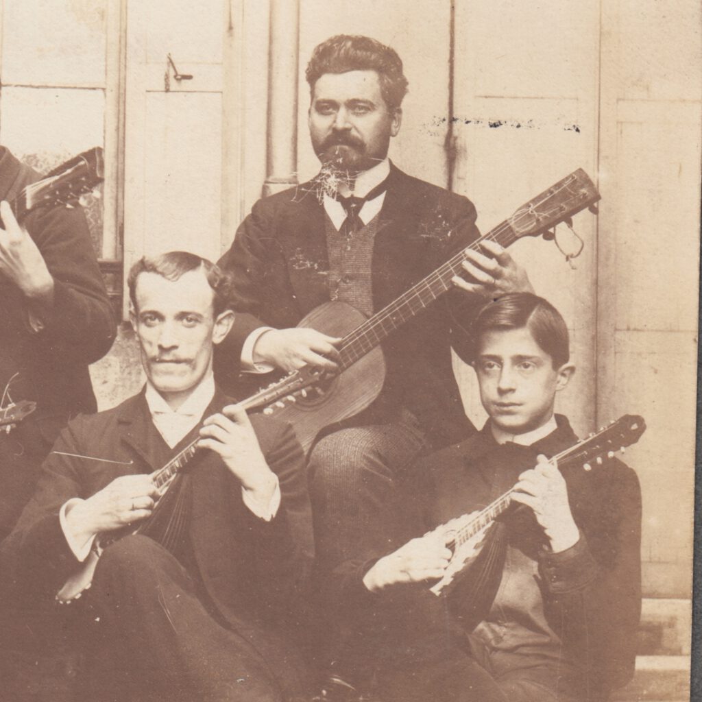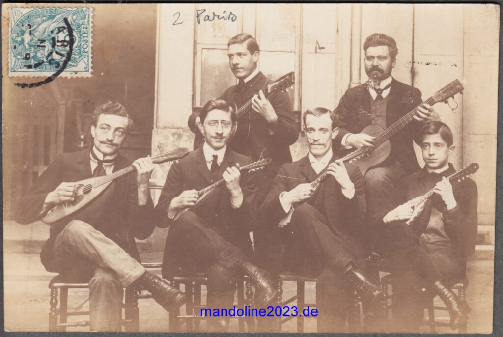 Sextett aus Paris um 1900 Beitrag veröffentlicht:17. Februar 2026 Beitrags-Kategorie:Alte Postkarten Diese alte Postkarte zeigt 6 Spieler mit Mandola, drei Mandolinen und zwei Gitarren. Die Briefmarke wurde 1900 herausgegeben, sie wurde in Paris abgestempelt. Die Karte wurde an den Komponisten Georges Goldberg geschickt. Das könnte dir auch gefallen Trachtengruppe mit Mandolinen 1917 20. Juli 2025 Gemischtes Ensemble mit Harp-Lute und Mandoline 18. Mai 2024 Alte Postkarten – Quintett mit Bandoneon 27. März 2023