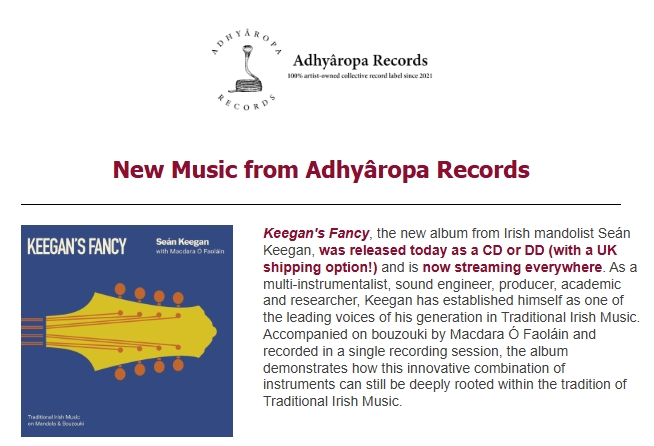 Sean Keegan hat bei Adhyâropa Records sein Album Keegan’s Fancy veröffentlicht. Er spielt irische Musik mit Mandola, begleitet von Macdara Ó Faoláin am irischen Bouzoiuki.